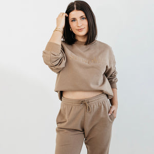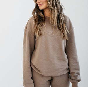 The Sunday Club Crew Neck features a relaxed fit with dropped shoulders.